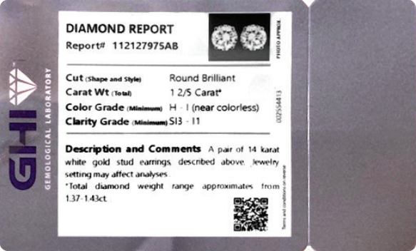 All pairs come with a credit card report ensuring that every diamond was tested to be natural